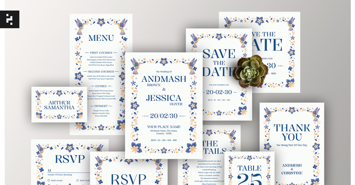Wedding Invitation Suite templates is a clean, creative, simple and effective invitation that include with rsvp, addressing, etc. What’s Inside Wedding Invitation: 5×7 inchesSave the Date Postcards 4.25×6 inchesSave The Date Square 5.25x.5.25 inchesRSVP: 5×3.5inches, Front & Back Design (2 Sides)Details Cards_4x5.5 BleedTable Menu Thin_4x8 InchesTable Number Cards_3.15×3.15 InchesThank You Cards_4.13×5.83 InchesTable Name Cards_3.54×2.16...
