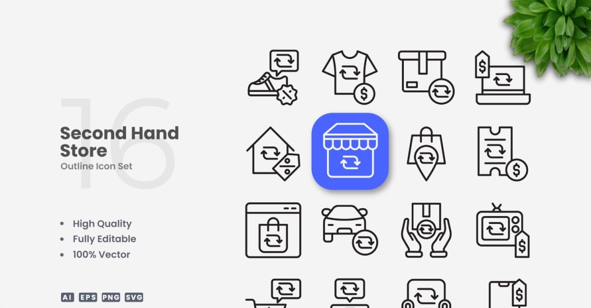 Set of 16 Second Hand Store Outline Icons | Simple and clean design, perfect for websites, mobile apps, books, social media, infographics, flyer, print, banners, posters and many more. To resize or change color you can easily edit on vector software like Adobe Illustrator and CorelDRAW. Features : High Quality Design100% Vector100% CustomizableEditable StrokeEasy Drag and...