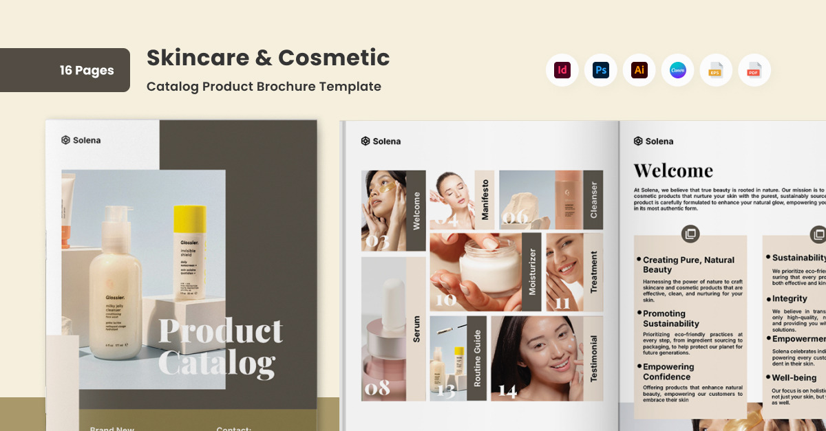 Build a premium brand identity with this clean lookbook-style brochure, ideal for high-end skincare products. Featuring modern typography and soft, natural tones, it’s perfect for showcasing product lines, telling your brand story, and attracting beauty-conscious customers. **Highlights:** – 16 customizable pages document – A4 format size with 3mm bleed – Free fonts & icon used...