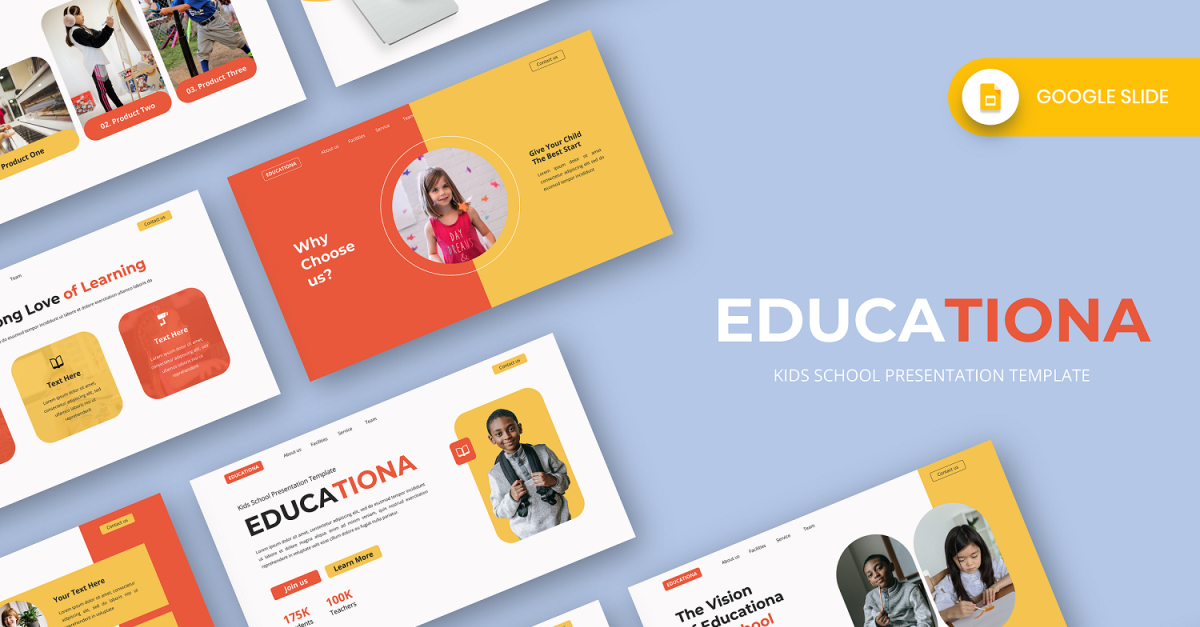 Introducing **Educationa – Kids School Google Slide Template** This Presentation Template can be used for any variety of purposes, such as: Education, University, School, College, Student, Teacher, Seminar, Corporte, Digital Marketing, Technology, Creative, Company Profile, Multimedia, Corporate and Business, Photography, Project, Multipurpose ,Startup, Pitch Deck,Industry and also can be used for Personal Portfolio. **FEATURES** –...