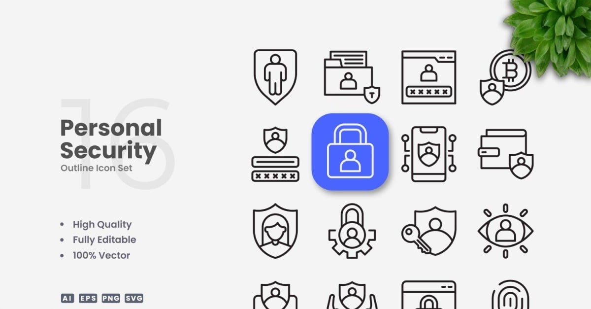 Set of 16 Personal Security Outline Icons | Simple and clean design, perfect for websites, mobile apps, books, social media, infographics, flyer, print, banners, posters and many more. To resize or change color you can easily edit on vector software like Adobe Illustrator and CorelDRAW. Features : High Quality Design100% Vector100% CustomizableEasy Drag and Drop Files...