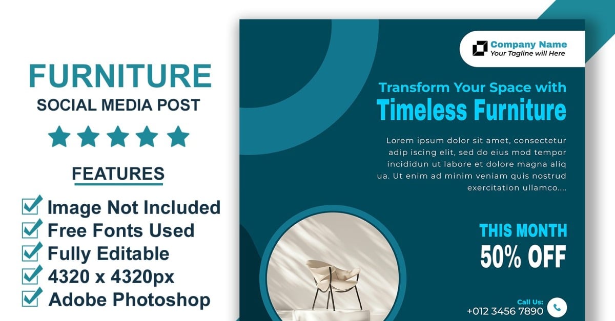 Furniture Clearance Sale Instagram Post Template PSD This high-conversion Instagram post template is tailored for furniture clearance sales or end-of-season promotions. Bold call-to-action elements drive more clicks and engagement. Highlights Bold sale design4320 x 4320 pxRGB Colors300 DPI qualitySmart Object LayerCustomizable text and price tags Includes Files PSD FileHelp Notes (.txt)