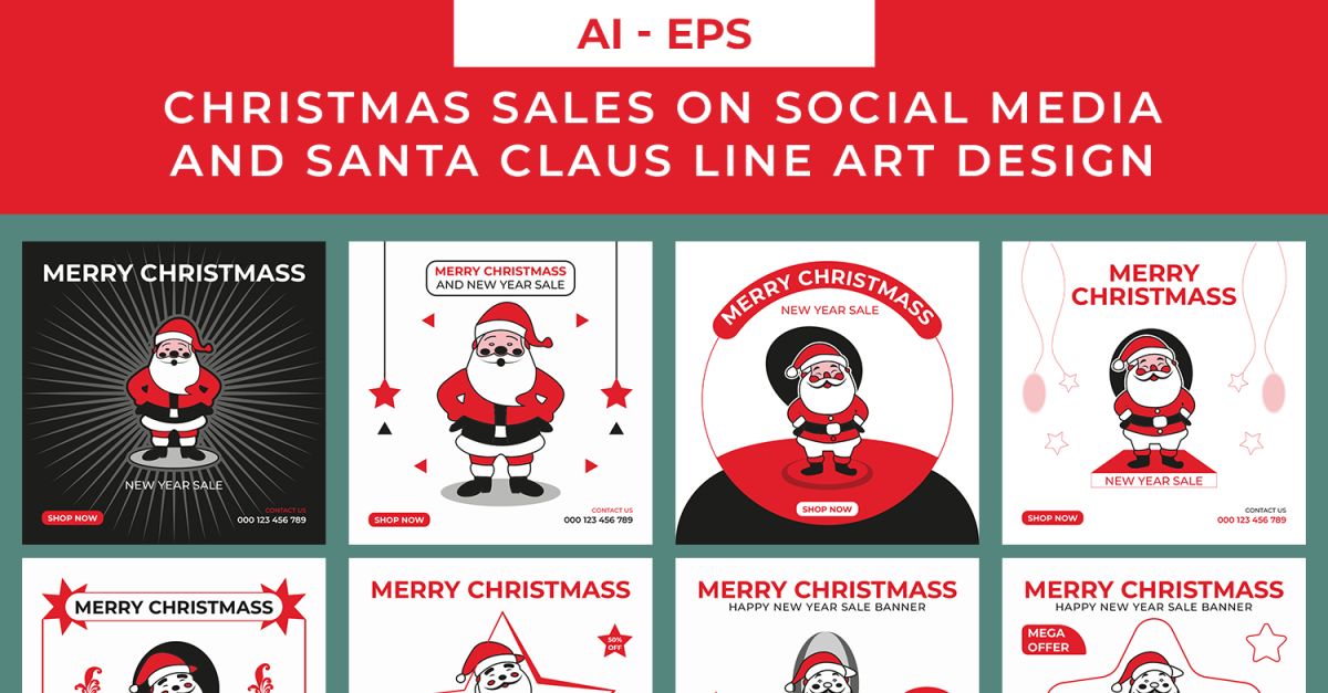 Christmas sales on social media and Santa Claus Line Art Design Features:- – Easily customizable and editable – 4 editable Illustrator files, 8 Social Media and 4 Santa Claus Line Art Design – Social Media Size: 1080×1080 pixels – RGB Color and 72 DPI Resolution – help file included – free fonts used Zip File...