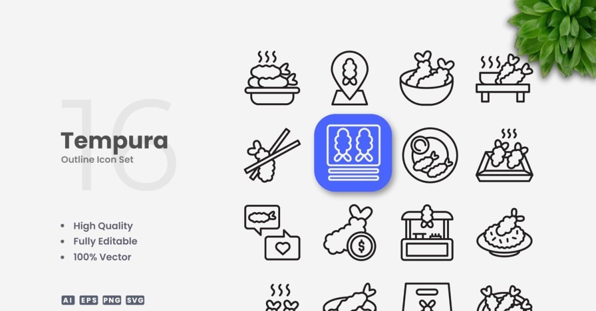 Set of 16 Tempura Outline Icons | Simple and clean design, perfect for websites, mobile apps, books, social media, infographics, flyer, print, banners, posters and many more. To resize or change color you can easily edit on vector software like Adobe Illustrator and CorelDRAW. Features : High Quality Design100% Vector100% CustomizableEasy Drag and Drop Files Included...